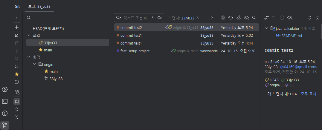commit을 알아보기 위해 commit message를 "commit test"와 같이 의미 없는 내용으로 작성해봤다.